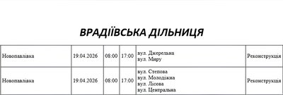 Графік відключення світла по адресах 19 квітня, Врадіївська дільниця. АТ «Миколаївобленерго»