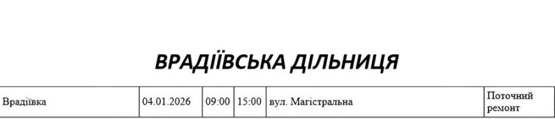 Графік відключення світла по адресах 4 січня, Врадіївська дільниця. АТ «Миколаївобленерго»
