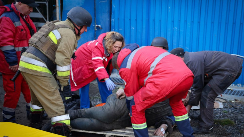 Медики разом із рятувальниками надають допомогу пораненому. Головне управління ДСНС у Миколаївській області
