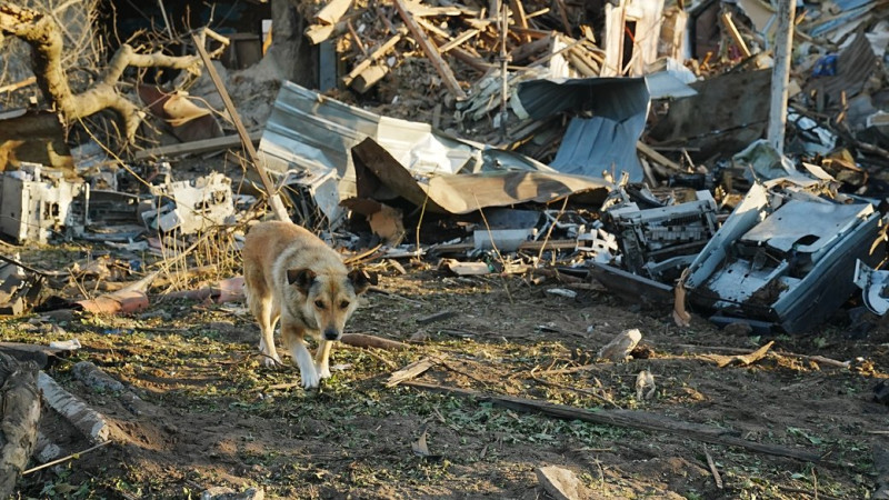 Собака серед руїн внаслідок ракетної атаки. Миколаїв, 3 серпня 2025 року. Суспільне Миколаїв/Роман Волинський