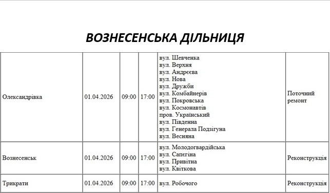 Графік на 1 квітня, Вознесенська дільниця АТ «Миколаївобленерго»