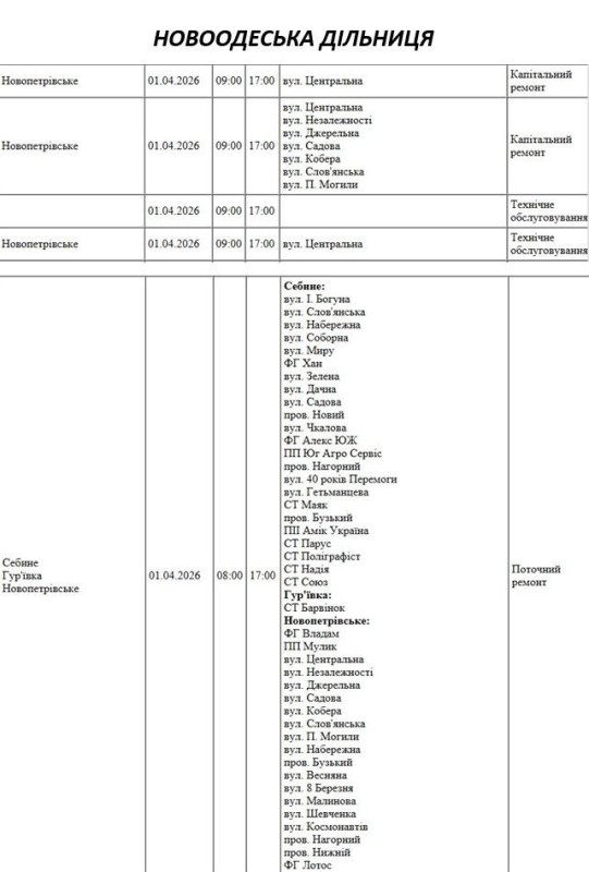 Графік на 1 квітня, Новоодеська дільниця АТ «Миколаївобленерго»
