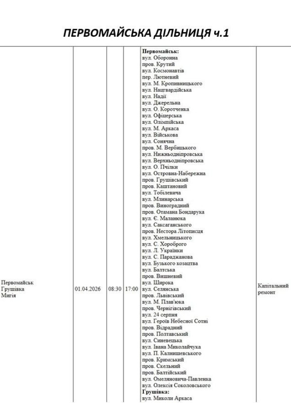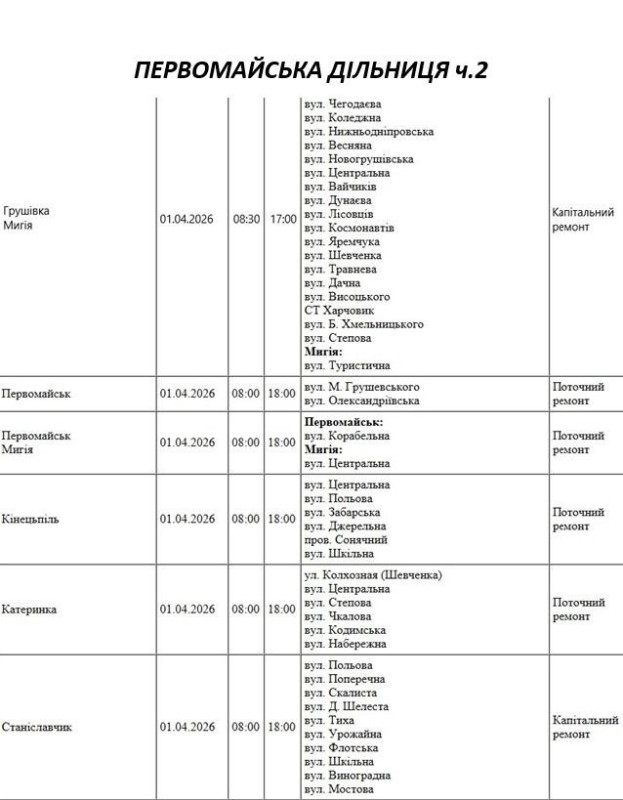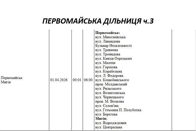 Графік на 1 квітня, Первомайська дільниця АТ «Миколаївобленерго»