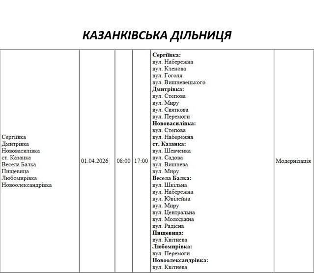 Графік на 1 квітня, Казанківська дільниця АТ «Миколаївобленерго»