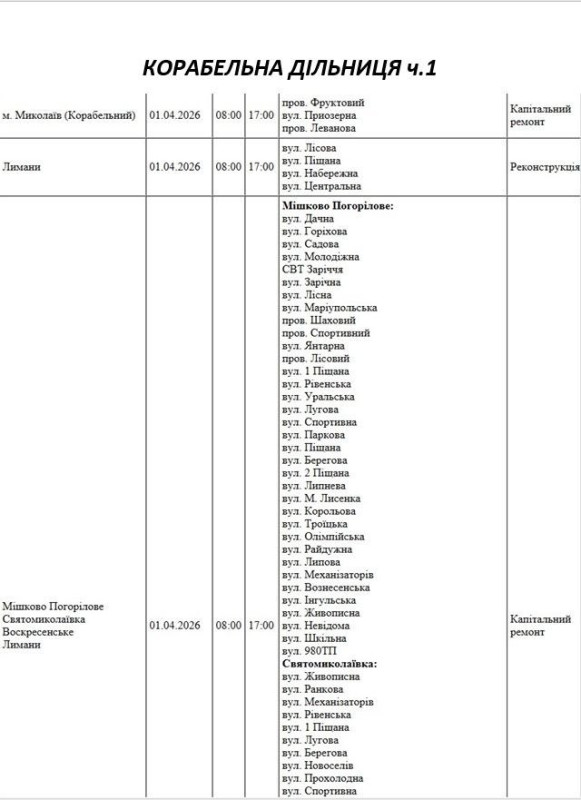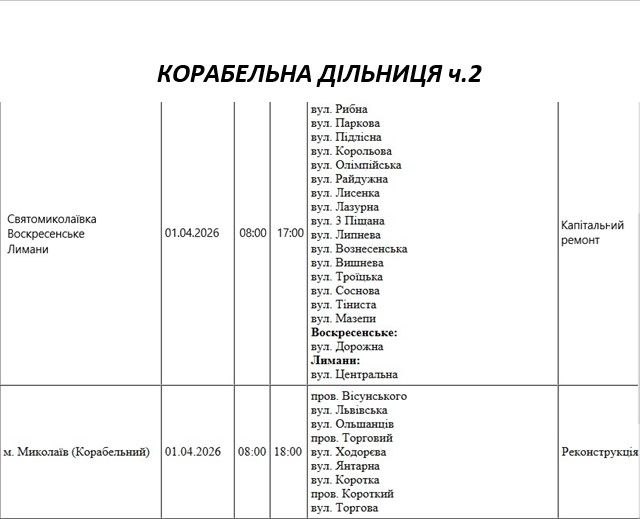 Графік на 1 квітня, Корабельна дільниця АТ «Миколаївобленерго»