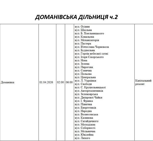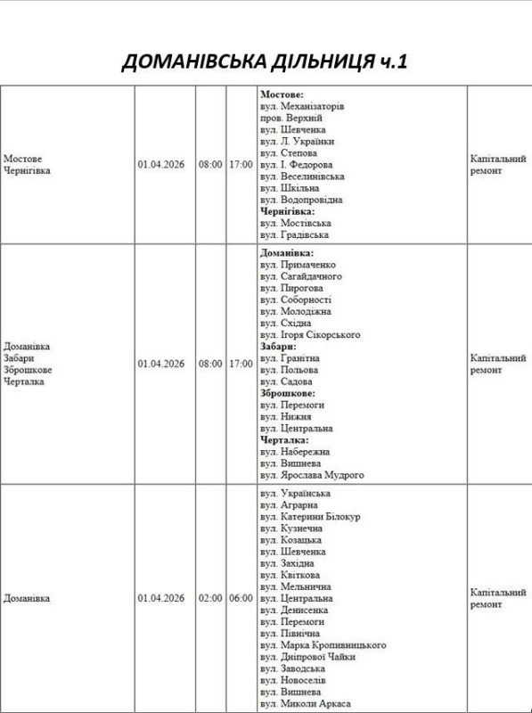 Графік на 1 квітня, Доманівська дільниця АТ «Миколаївобленерго»