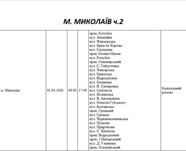 На Миколаївщині 1 квітня деякі вулиці залишаться без електропостачання. Це пов'язано із поточними ремонтними роботами, реконструкціями та технічним обслуговуванням.