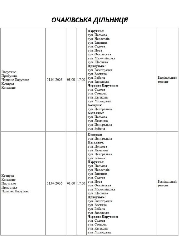 Графік на 1 квітня, Очаківська дільниця АТ «Миколаївобленерго»