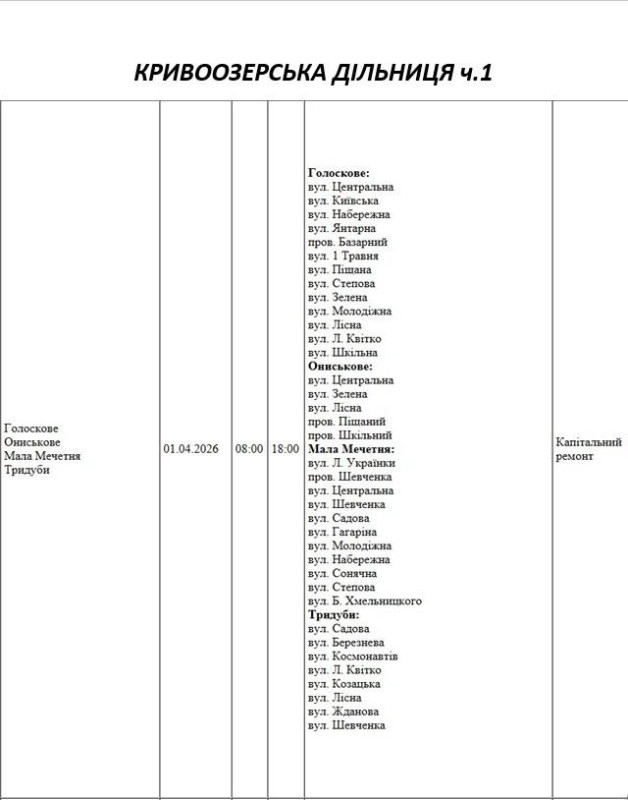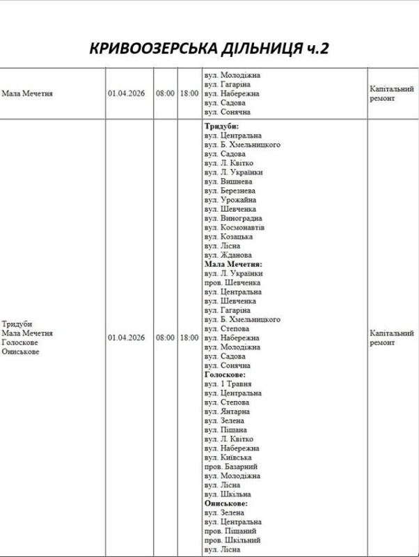 Графік на 1 квітня, Кривоозерська дільниця АТ «Миколаївобленерго»