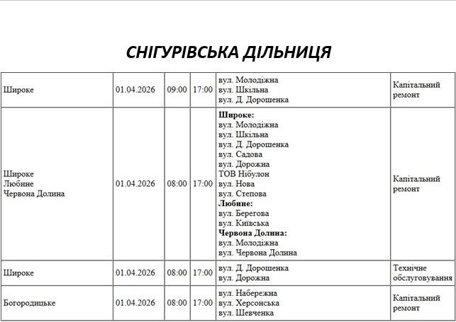 Графік на 1 квітня, Снігурівська дільниця АТ «Миколаївобленерго»