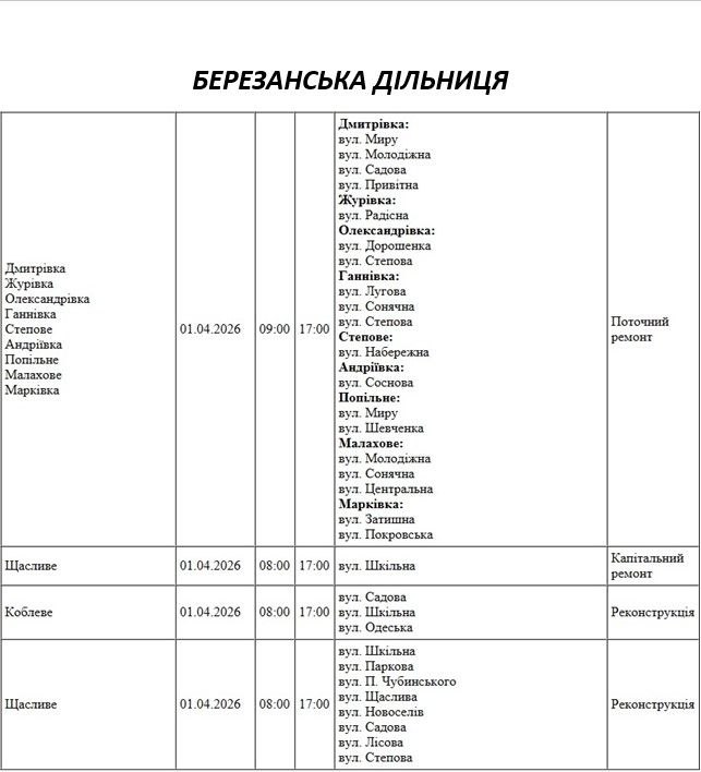 Графік на 1 квітня, Березанська дільниця АТ «Миколаївобленерго»