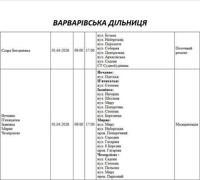Графік на 1 квітня, Варварівська дільниця АТ «Миколаївобленерго»