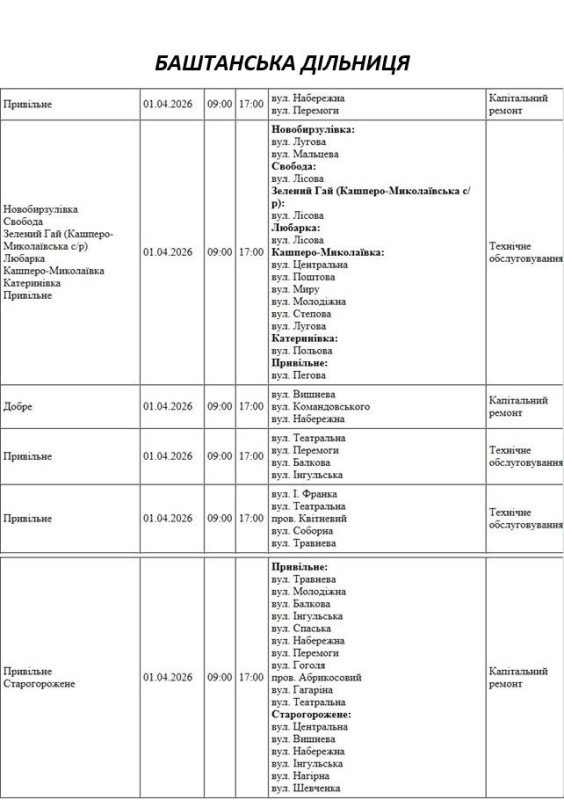 Графік на 1 квітня, Баштанська дільниця АТ «Миколаївобленерго»