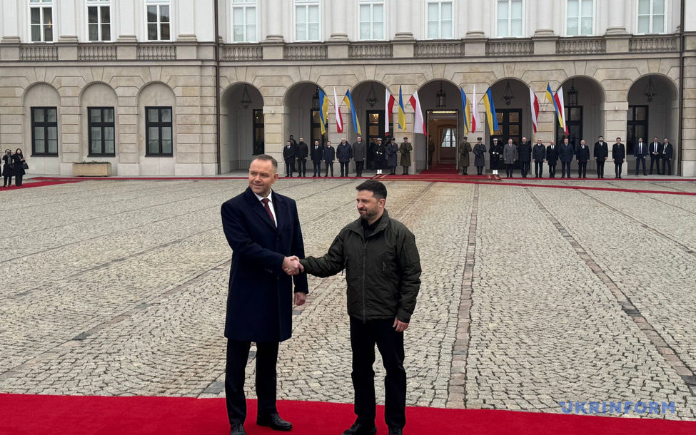 Президент Володимир Зеленський прибув до президентського палацу у Варшаві, де його зустрів польський колега Кароль Навроцький.
