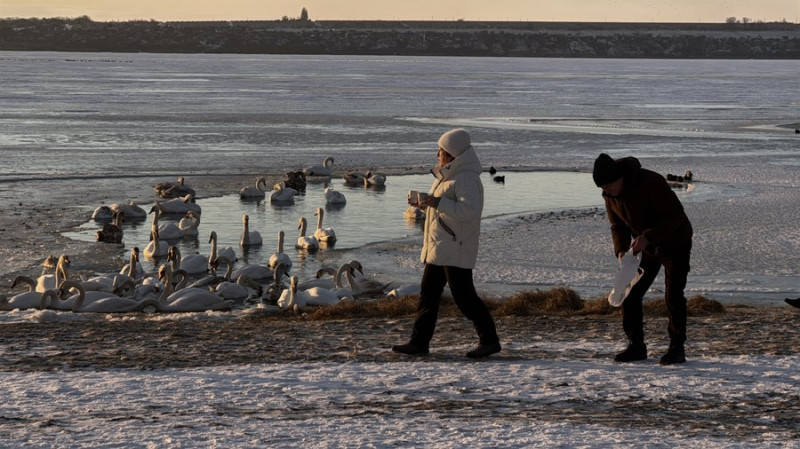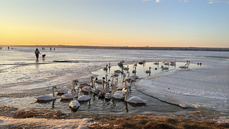 Чоловік спостерігає за зграєю лебедів і качок на вкритому кригою узбережжі. Суспільне Миколаїв/Юлія Голокоз